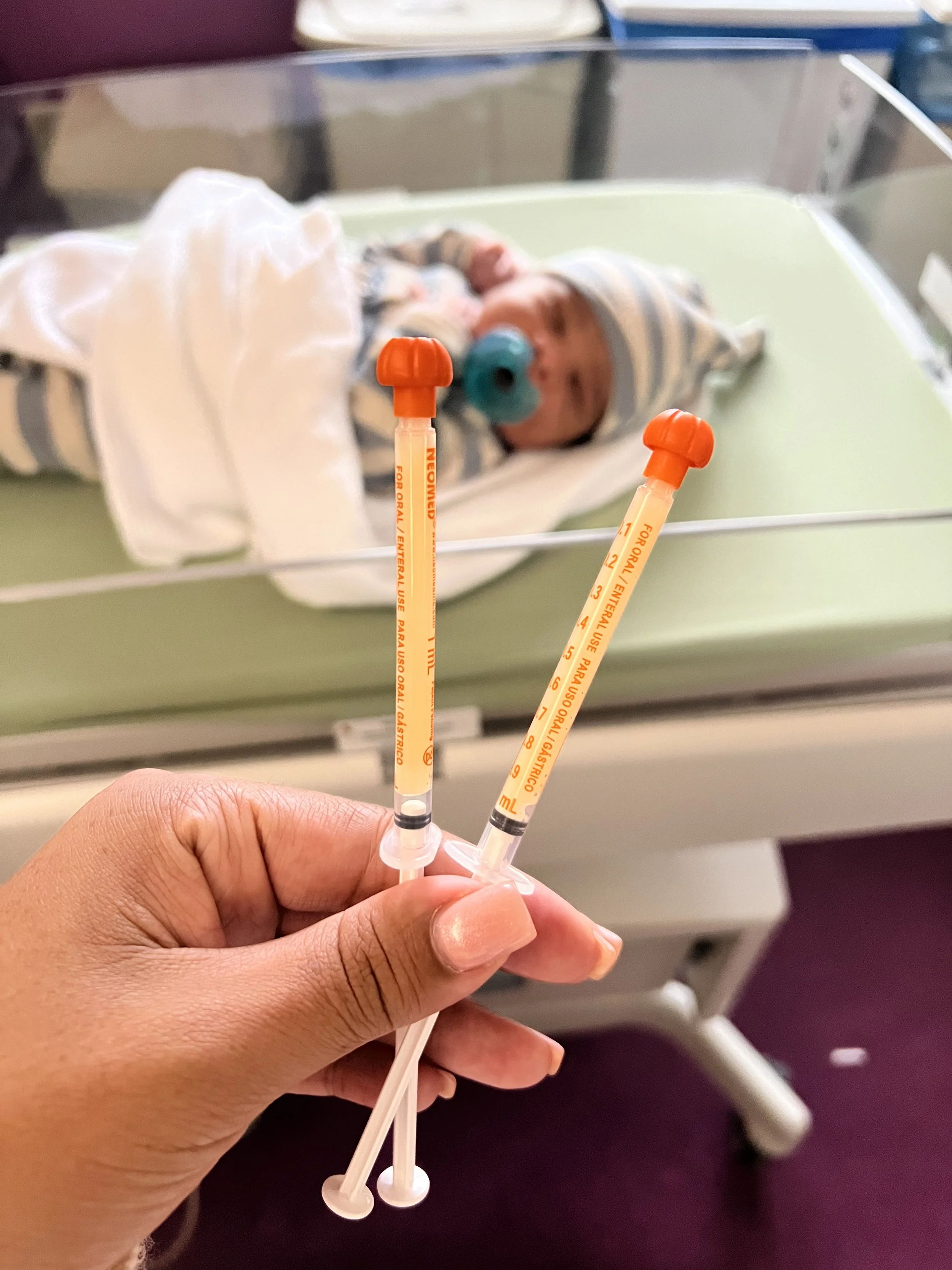 Still, I didn’t let it stop me. I pumped, latched, and trusted the process. Thankfully, newborns don’t need much at first, and I was able to collect syringes of liquid gold.